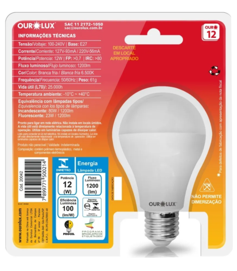 Lampada Led 12w E27 Ourolux Luz Branca Fria 6500k Superled